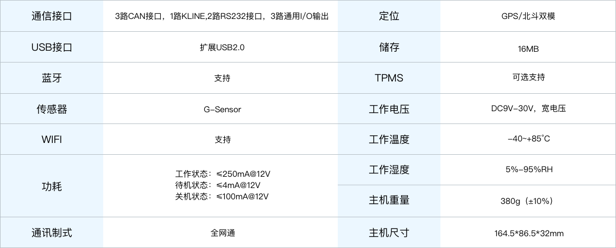 T-BOX产品是一款符合国家交通运输部对新能源交通运输车辆的技术要求(符合GB/T 32960),可对车辆电池数据、ECU数据、车况数据、定位数据、驾驶行为数据等进行监 测与存储,并上传至车联网平台再进行大数据的深度挖掘,同时具备远程升级,故障诊断等功能,广泛应用于新能源汽车前装市场、乘用车、商用车等租赁市场。